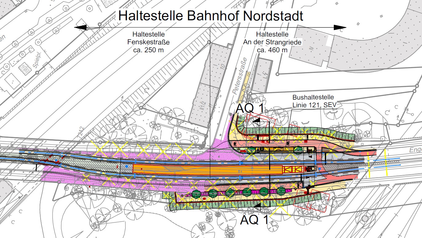 Lageplan für den Hochbahnsteig Bahnhof Nordstadt zwischen Fernbahn (links) und S-Bahn (rechts)