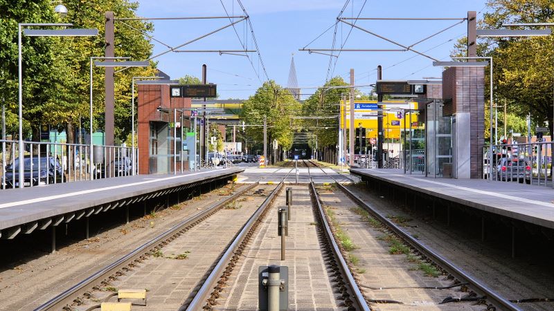 Nach dem Tunnelende führt die Strecke über eine Rampe an die Oberfläche. Die Trasse wird auf einem separaten Bahnkörper mittig auf der Hans-Böckler-Allee geführt.