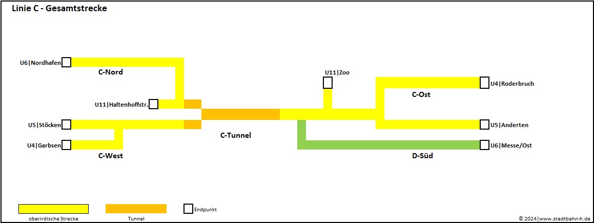 Die Linie C führt in der Planung nach dem Wehner-Plan aus dem Nordwesten der Stadt (Stöcken/Marienwerder) über Steintor, Kröpcke, Aegidientorplatz in Richtung Osten (Misburg). Ein erster Teil des C-Tunnels zwischen Kröpcke und Aegidientorplatz wurde bereits zusammen mit dem B-Tunnel errichtet (ab Januar 1976).