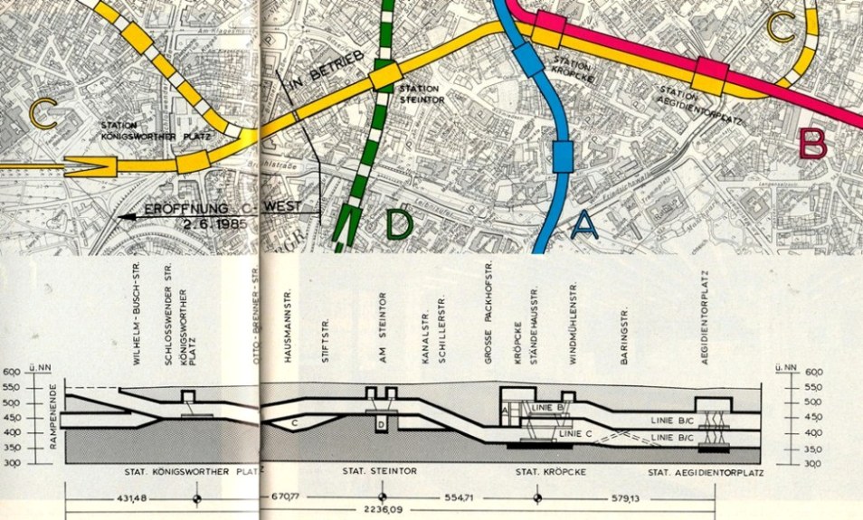 Liegen die Gleise der Linien B und C am Kröpcke noch linienrein übereinander in separaten Stationen wird über ein Kreuzungsbauwerk