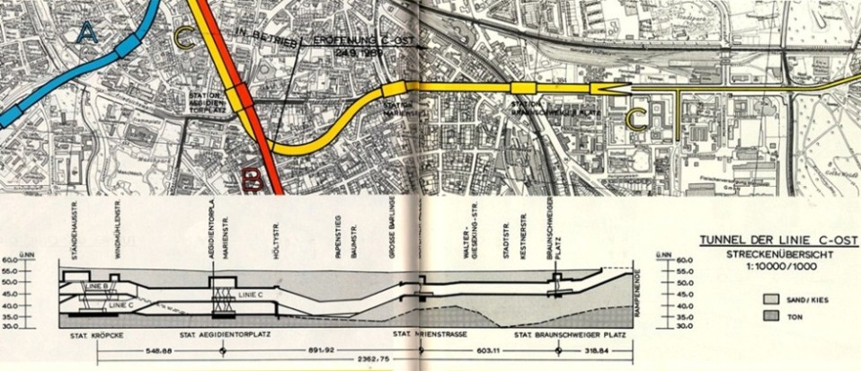 die stadtauswärts fahrenden Linien, genauso angeordnet wie eine Ebene höher. In Höhe Wilhelmstraße zweigt dann der Tunnel der Linie C-Ost