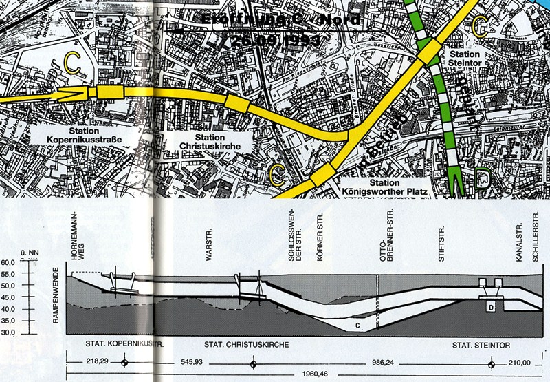 Auf dem Weg zur nächsten Station wird in Höhe Otto-Brenner-Str./Lange Laube der Tunnel der C-Nord angeschlossen. Hierzu am Ende mehr.