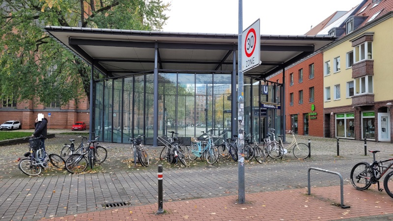Die nächste Station befindet sich unterhalb des gleichnamigen Platzes. Über zwei Eingänge (Ecke Bischofsholer Damm und zwischen Plathner-