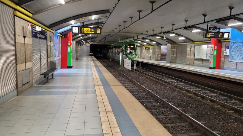 über welche die Station mit sechs Zugängen erreichbar ist, liegt zunächst die Ebene -2 mit den stadteinwärtsfahrenden Gleisen. An einem