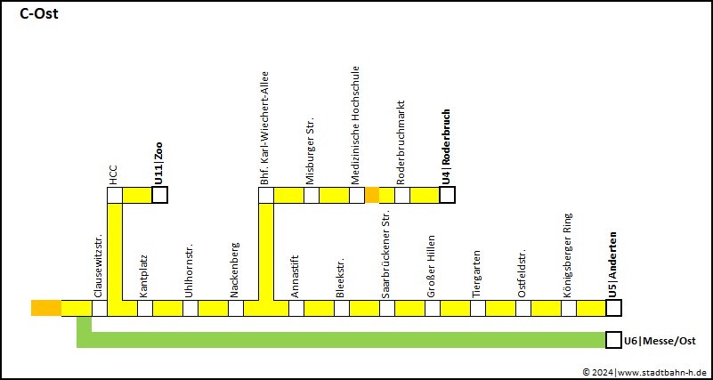 Die Linie C-Ost ist stark verzweigt. Wenn man auch die D-Süd dazu zählt - diese Linie nutzt ja auch den C-Tunnel - sind ingsgesamt vier Streckenäste vorhanden. Nur durch den Bau des Tunnels C-Nord in die Nordstadt können hier Durchgangslinien gebildet werden. Trotzdem ist der Tunnel mit vier Linien sehr gut belegt und gerade im Berufsverkehr sehr stauanfällig.
