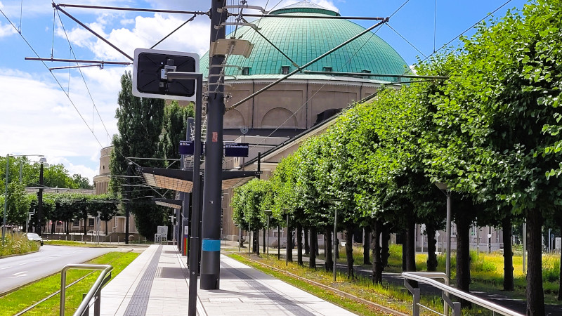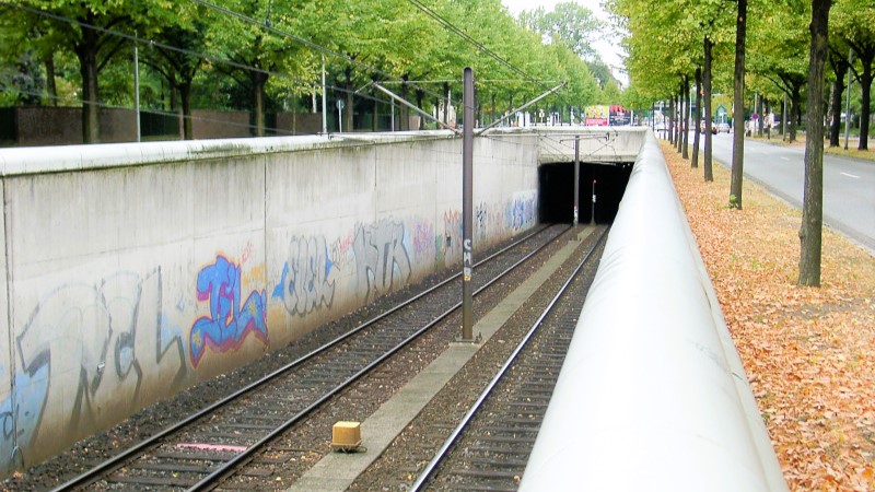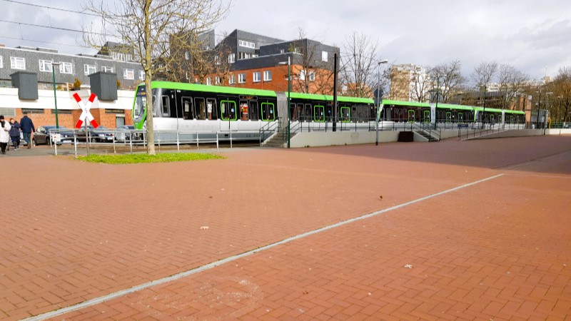 Nach dem Tunnelende führt die Strecke über eine Rampe an die Oberfläche. Die Trasse wird auf einem separaten Bahnkörper mittig auf der Hans-Böckler-Allee geführt.