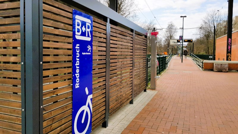 Endstation Roderbruch | Blick auf den östlichen Ausgang der Station mit B&R-Parkhaus | © 02/2020