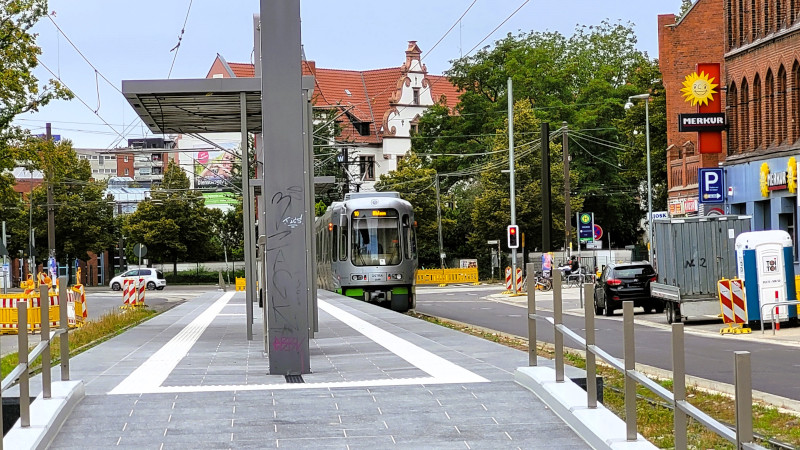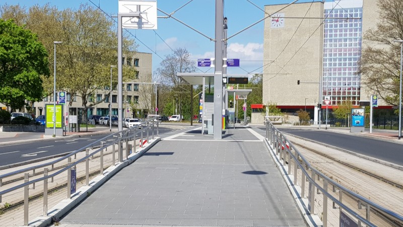 Haltestelle anzufahren. Im Dezember 2018 wurde der neue Mittelhochbahnsteig eröffnet. Danach teilt sich die Bahn die Straße wieder