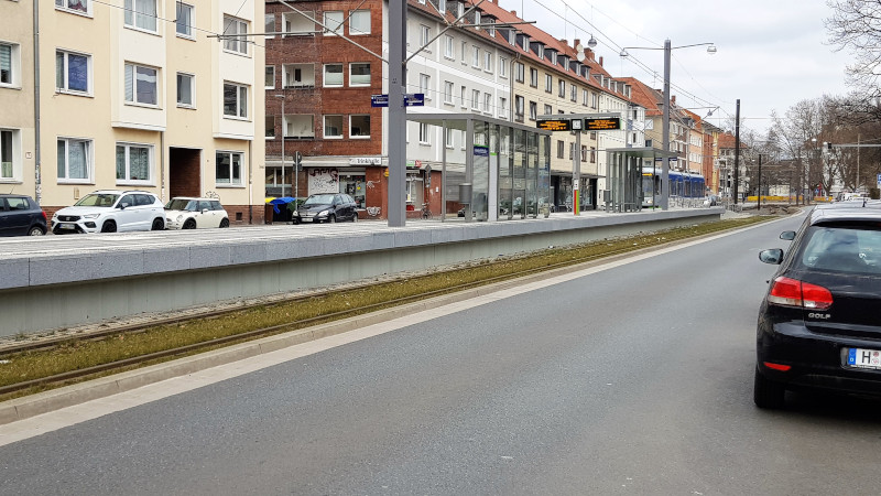 Ab Kötnerholzweg ist die Limmerstraße wieder eine Ausfallstraße mit entsprechendem Autoverkehr. Diese Station wurde wurde mit