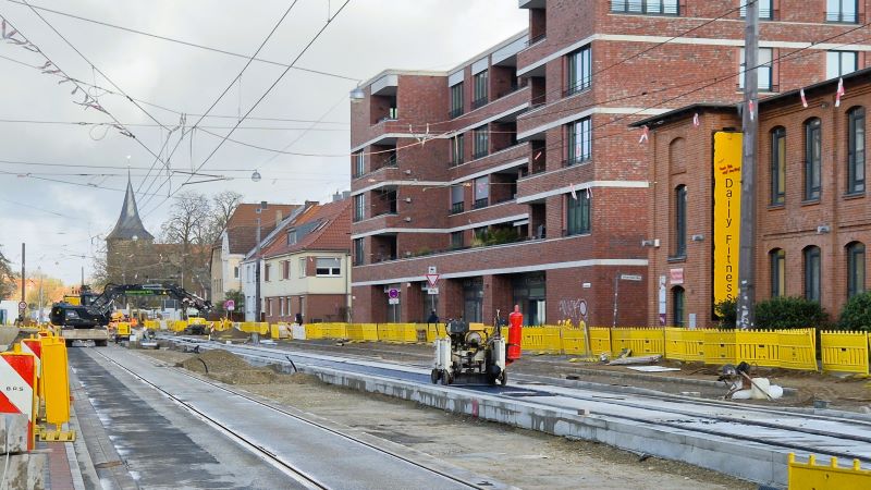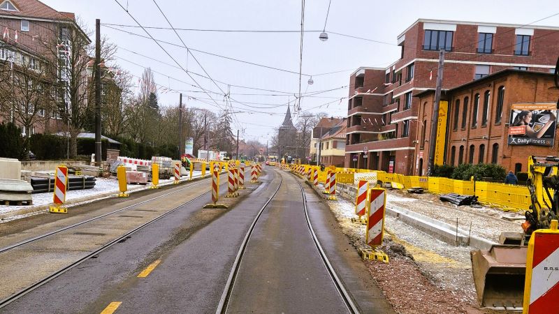 die neuen Schienen (links - stadteinwärts) sind verlegt. Die alten stadtauswärts führenden Gleise