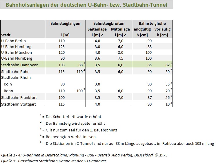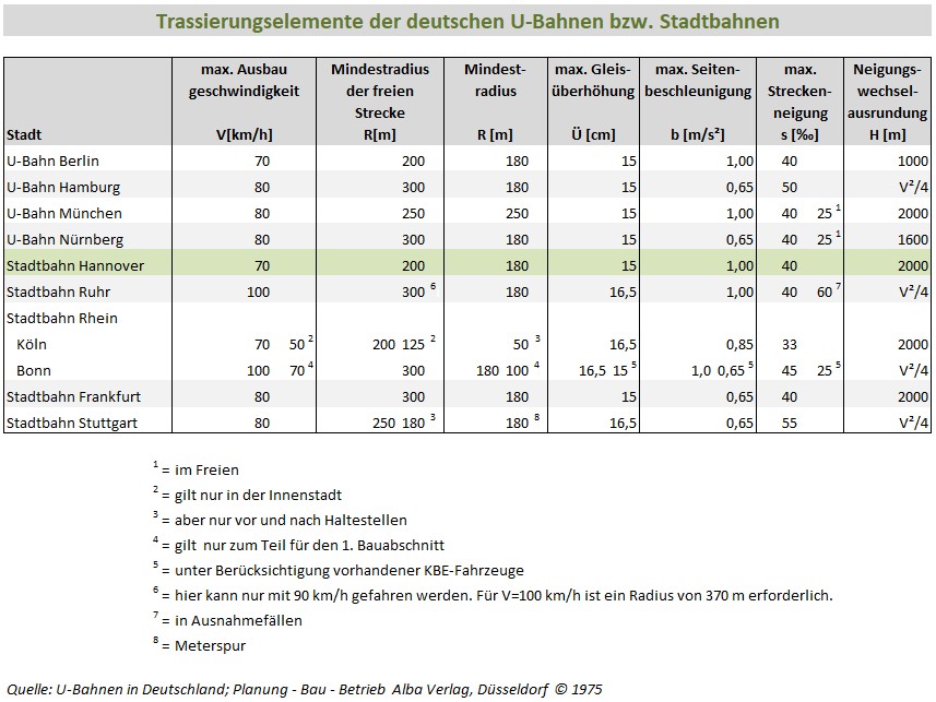 Hier folgt eine Übersicht über die Trassierungselemente bei deutschen U-Bahnen und Stadtbahnen im Vergleich zur Stadtbahn Hannover.